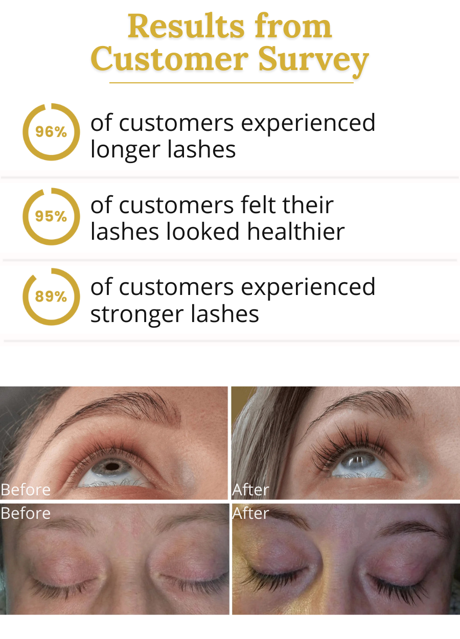 ✓ 96% experienced visibly longer lashes within 12 weeks, 91% experienced fuller and more defined lashes and 97% were satisfied with their purchase or would buy again.