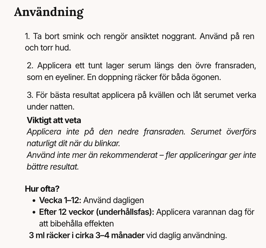 Att använda mer än rekommenderat ger inte bättre resultat och kan öka risken för känslighet. Undvik att applicera flera lager eller att doppa borsten flera gånger. Applicera inte på den nedre fransraden – serumet fördelas dit naturligt när du blinkar. - För bästa effekt appliceras serumet på kvällen och får verka över natten. Vid applicering på morgonen, låt serumet torka helt innan du fortsätter med din makeuprutin.