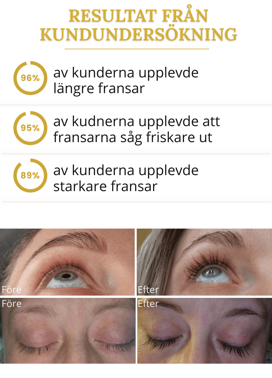 Fransarna upplevs fylligare, längre och mer välvårdade. För att behålla resultatet rekommenderas användning 3–4 gånger i veckan.