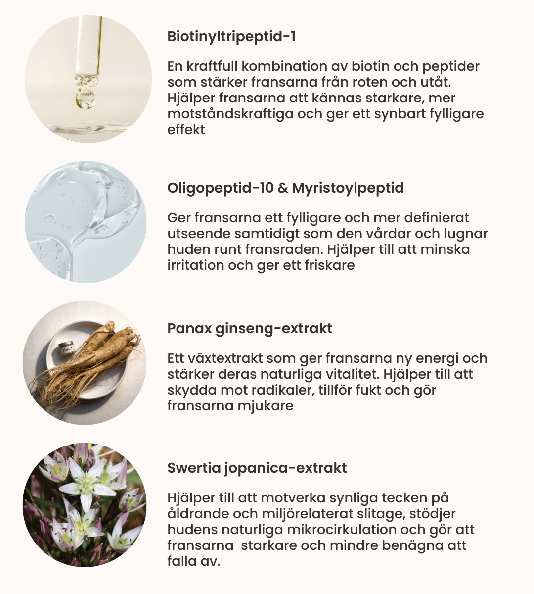 Vårt populära fransserum innehåller en effektiv kombination av peptider, vitamin B5, panthenol och vårdande växtextrakt. Formulan är utvecklad för att förbättra fransarnas utseende och ge dem ett fylligare, längre och mer välvårdat resultat med en naturlig glans.